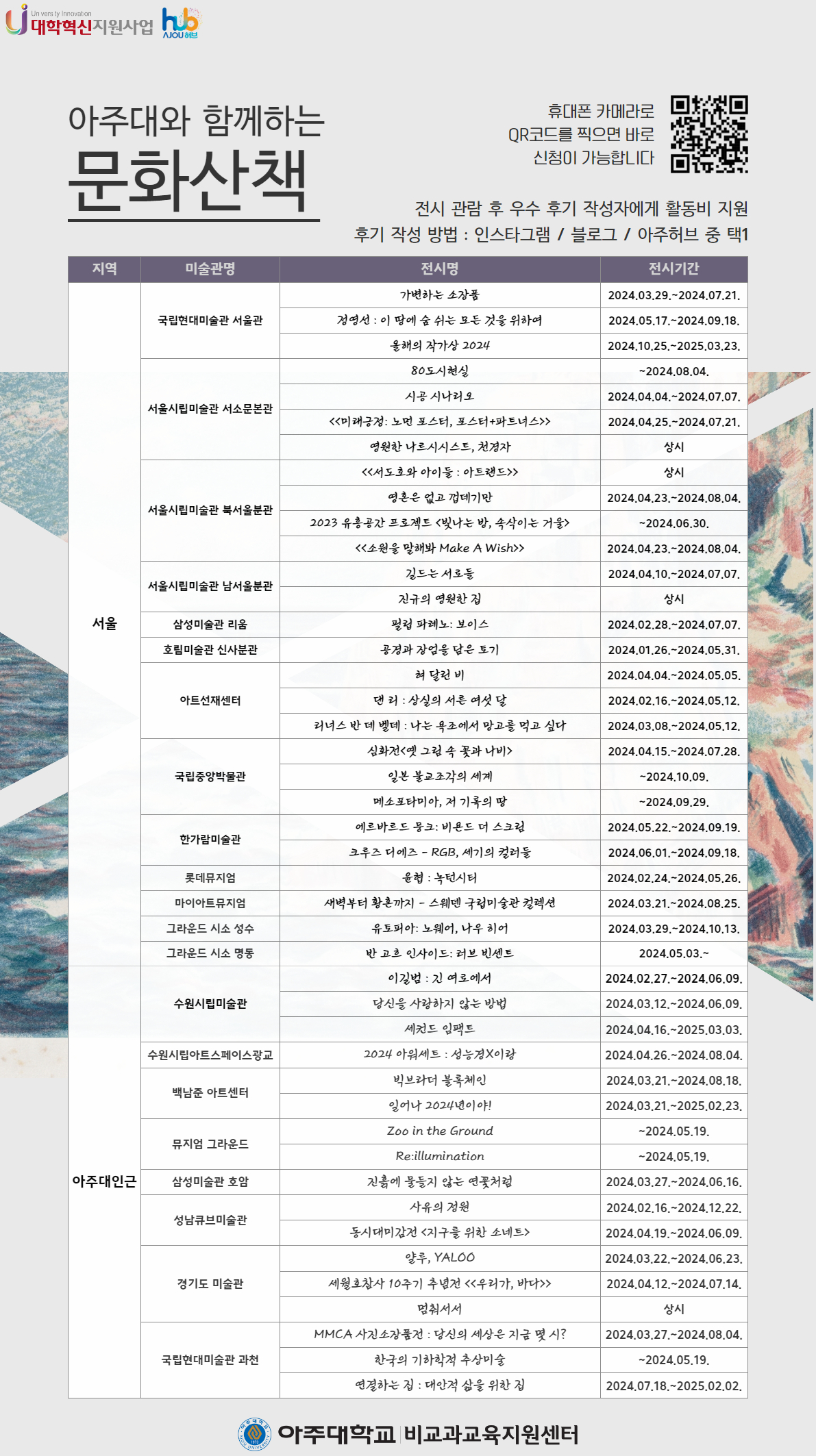 - 지정된 목록의 전시를 관람하고 인스타 / 블로그 / 아주허브 중 택1하여 인증샷 및 후기 작성